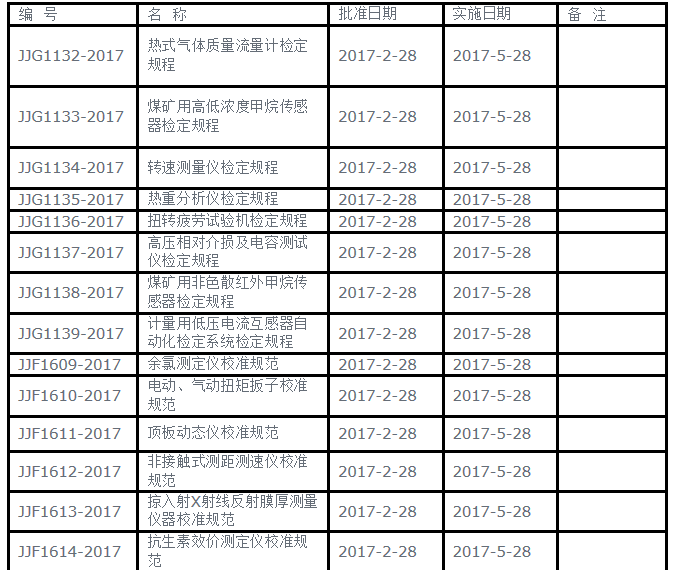 日前,国家质量监督检验检疫总局发布《热式气体质量流量计检定规程》等27个国家计量技术规范。其中,热式气体质量流量计检定规程、掠入射X射线反射膜厚测量仪器校准规范、转速测量仪检定规程、热重分析仪检定规程等21项仪器计量技术规范在内。